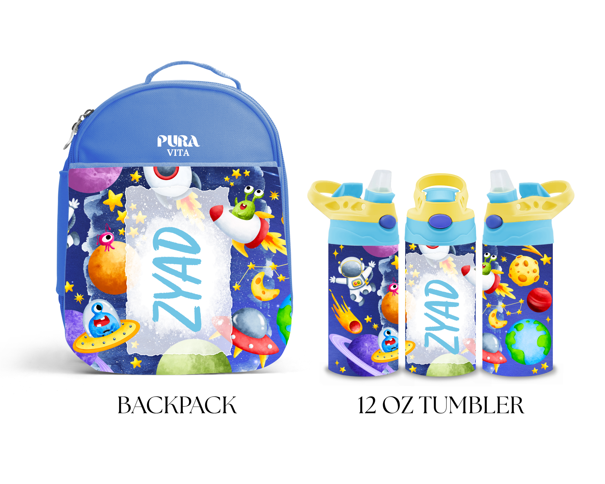 Blast off into the school day with our “Galactic Adventure” backpack and tumbler set! With colorful planets, spaceships, aliens, and your child’s name on both items, this bundle is out of this world.
