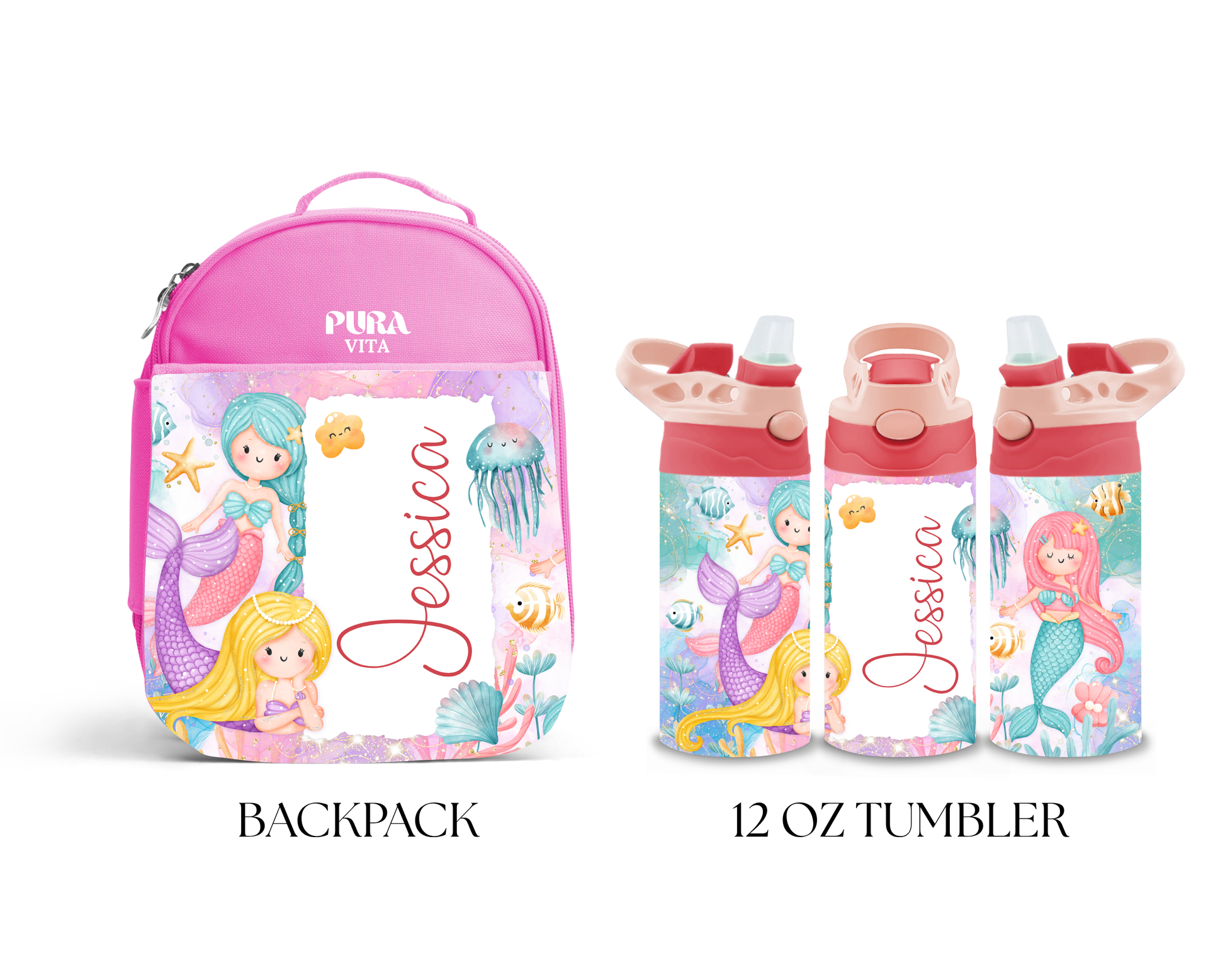 Make everyday feel like an underwater adventure with our “Magical Mermaids” backpack and tumbler combo! With dreamy pastel colors, adorable mermaid illustrations, and your child’s name printed on both items, it’s the perfect set for ocean-loving little ones.