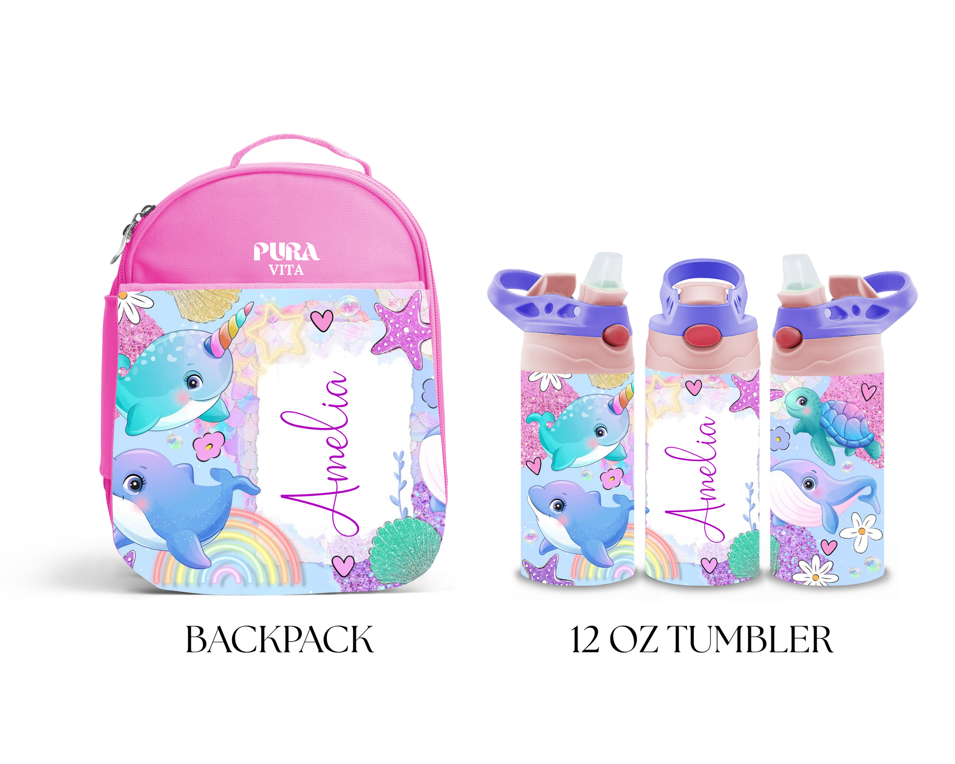 Dive into the day with the “Ocean Sparkle” backpack and tumbler set! Featuring magical sea animals, rainbows, glittery accents, and your child’s name on both items, this set is perfect for bright, bubbly personalities.