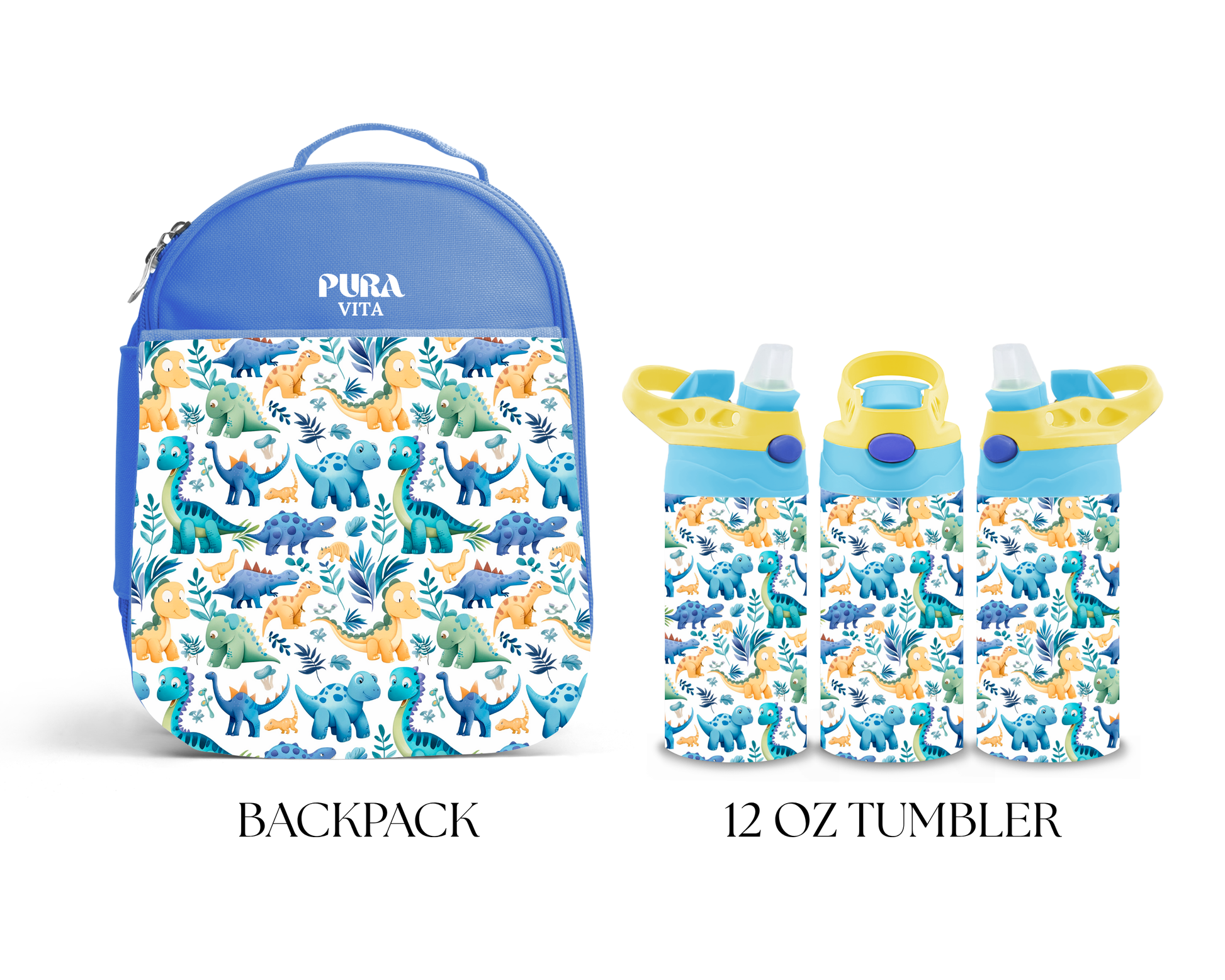 Cute, calm, and dino-loving! The “Pastel Dino Pals” backpack and tumbler combo features soft tones and adorable dinosaur characters — perfect for kids who prefer a more gentle and colorful look.