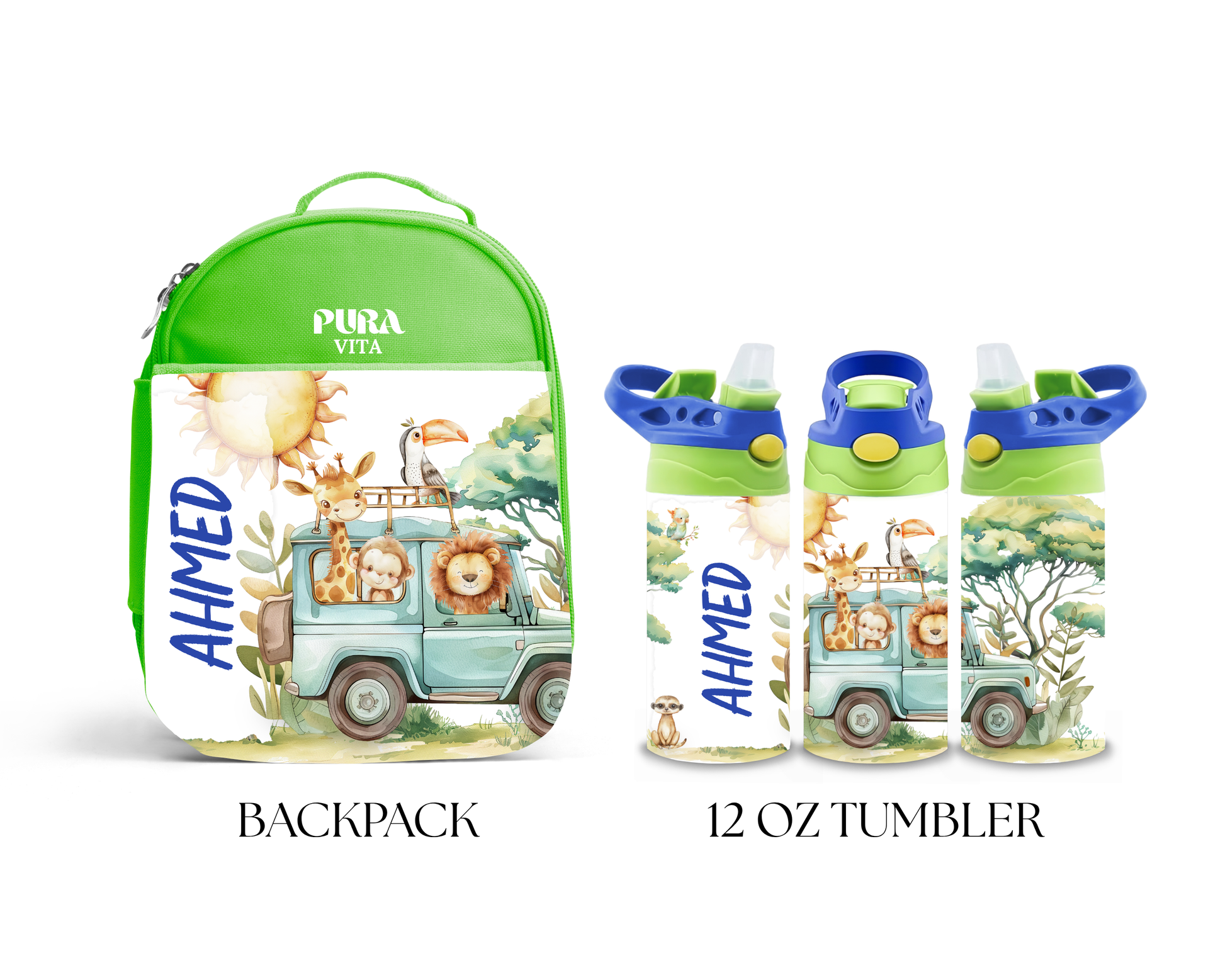 Bring a little wild fun to every school day with our “Safari Squad” backpack and tumbler set! With watercolor-style safari animals and your child’s name printed on both items, this bundle is full of charm and adventure.